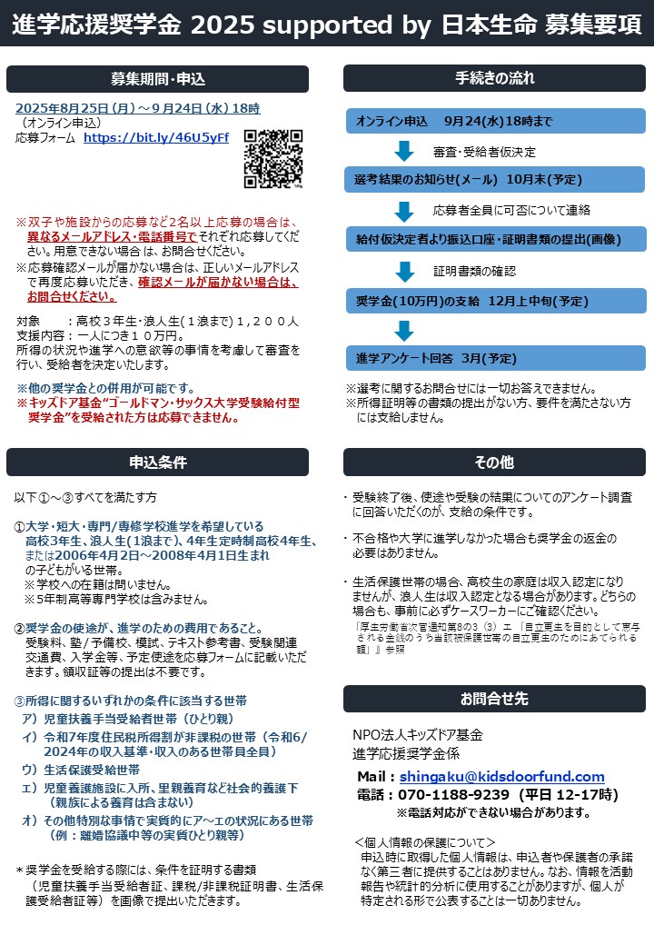 進学応援奨学金2025 supported by 日本生命 経済的に厳しい状況にあるご家庭の高3生・浪人生1200名に、進学準備資金として一人10万円の奨学金を給付します(返還不要の給付奨学金)。 一覧に戻る